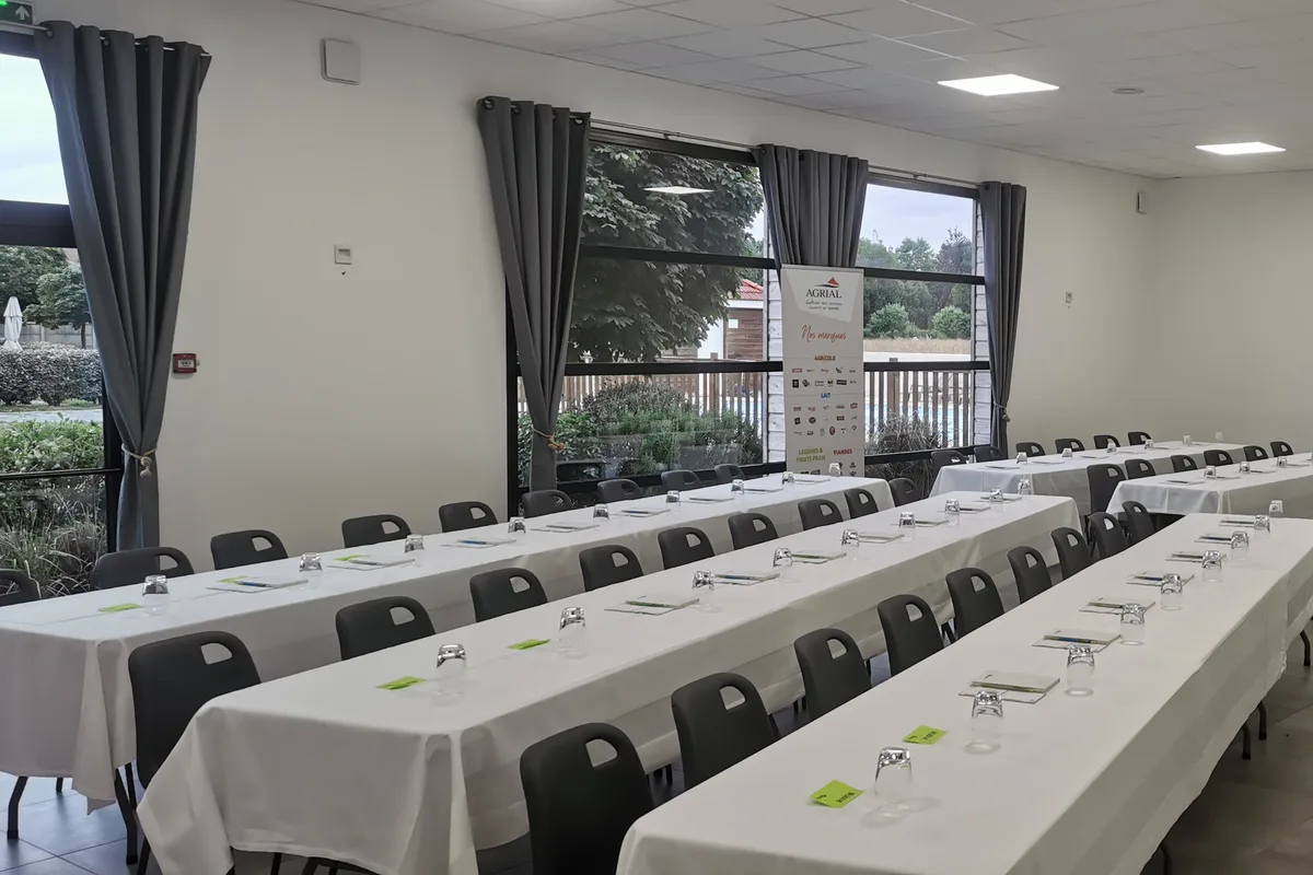- Une salle modulable, d’une capacité de 140 personnes assises (pour les repas et les réunions).
